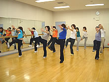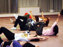 ミュ−ジックウォーキング次はサウンドエクササイズです。ヒップアップ、バストアップ、脂肪燃焼、美脚など、毎回いろいろなエッセンスを取り混ぜてカリキュラムを組むので、結構気合が入っています!前半のヤマですね。 |