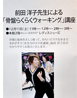 前田洋子による「骨盤らくらくウォーキング®」イベントを新宿伊勢丹で行いました。沢山のお客様に参加して頂き当日は大変賑やかなイベントになりました。来て頂いたお客様、また伊勢丹スタッフの方には大変感謝しております。ありがとうございます。来て頂いたお客様1人1人に丁寧に指導をしたかったのですが、時間が足りなく物足りない方もいたと思いますがまた是非「前田洋子ウォーキングスタジオ」に来て是非レッスンにご参加下さい。
